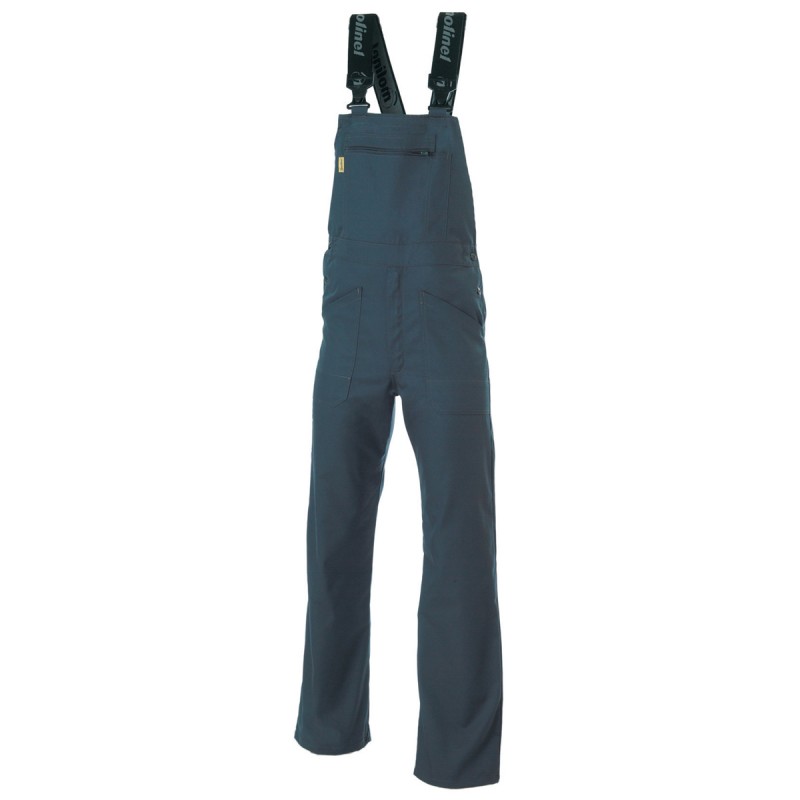 Larges bretelles élastiques, poche bavette avec fermeture à glissière et poche crayon, braguette glissière, 2 poches cuisses renforcées, ouvertures côtés boutonnage réglable, 1 poche arrière et 1 poche mètre renforcées